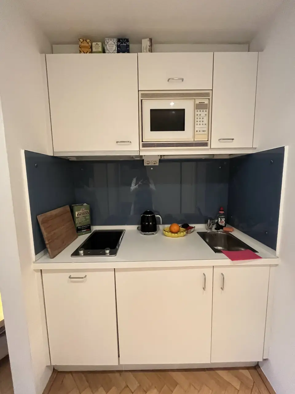 Sie gliedert sich in einen Vorraum, einen Wohnraum mit abgetrennter Kochnische (kein Backofen!)