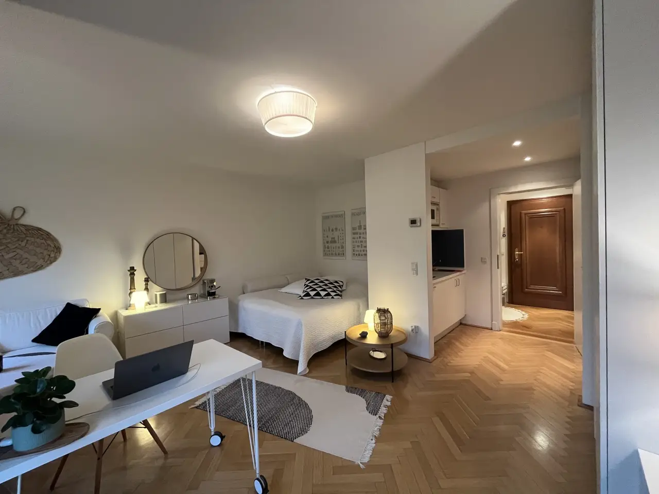 Die ca. 36 m² große Wohnung befindet sich im 1. Obergeschoss eines schönen Neubauhausesund gliedert sich in einen Vorraum, eine Küchennische, einen Wohn-/Schlafraum mit Zutritt zum Balkon sowie ein Badezimmer mit Toilette.