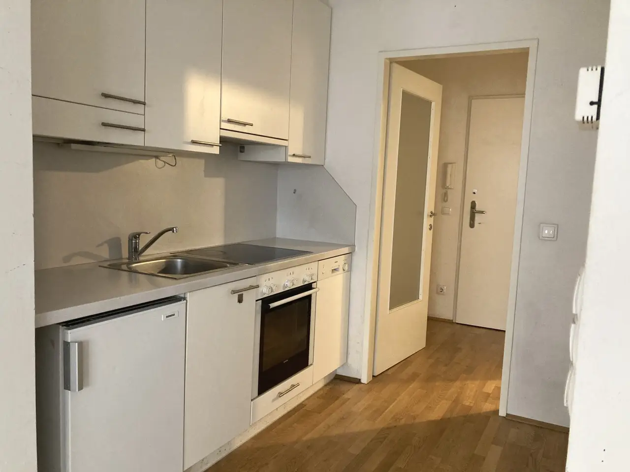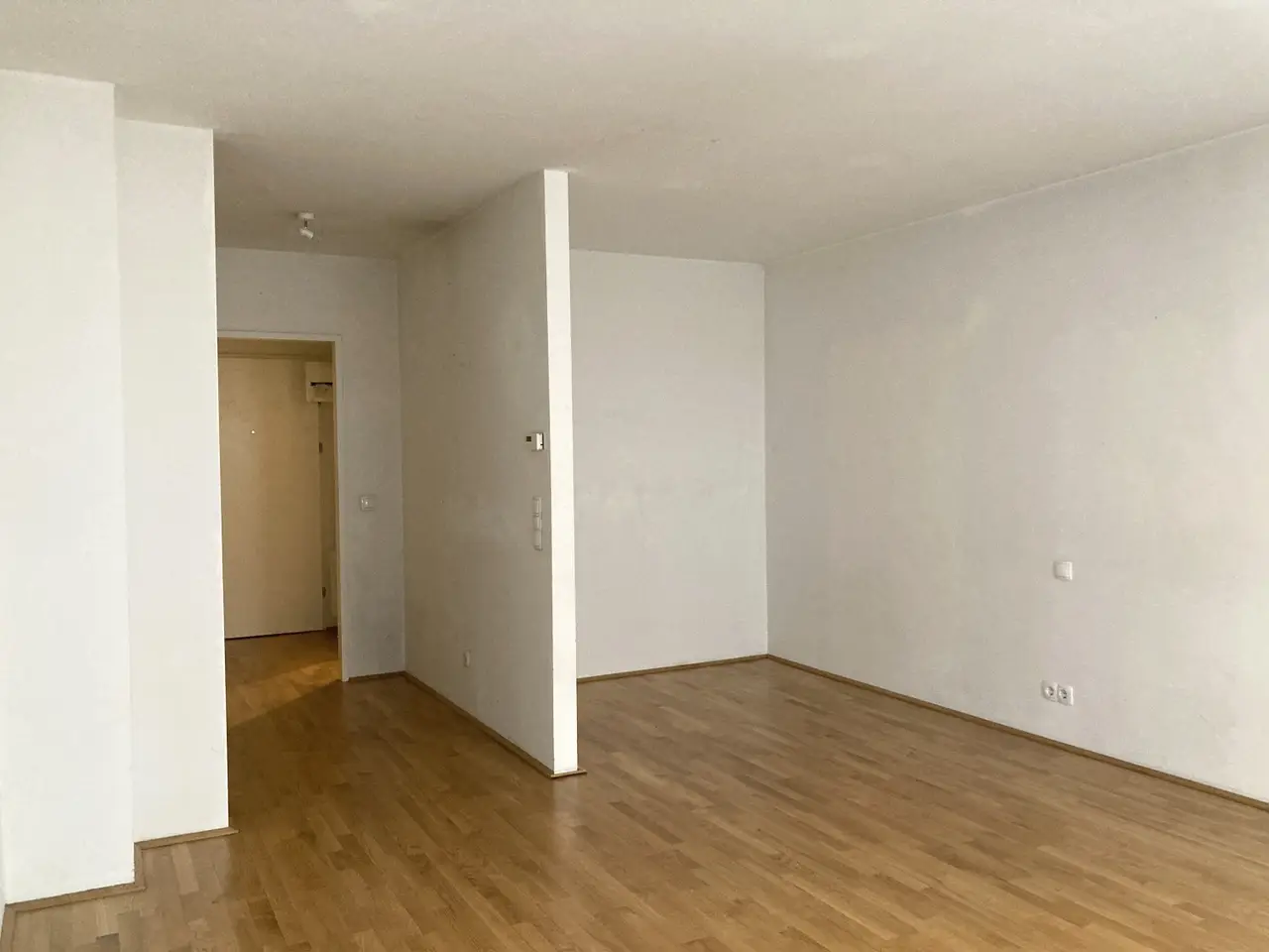 Die ca. 32 m² große Wohnung im 1. Obergeschoss eines Neubauhauses und besticht durch einen durchdachten Grundriss. Sie umfasst einen großzügigen Vorraum, einen hellen Wohnbereich mit Küchenzeile und Schlafnische sowie ein Badezimmer mit Toilette.