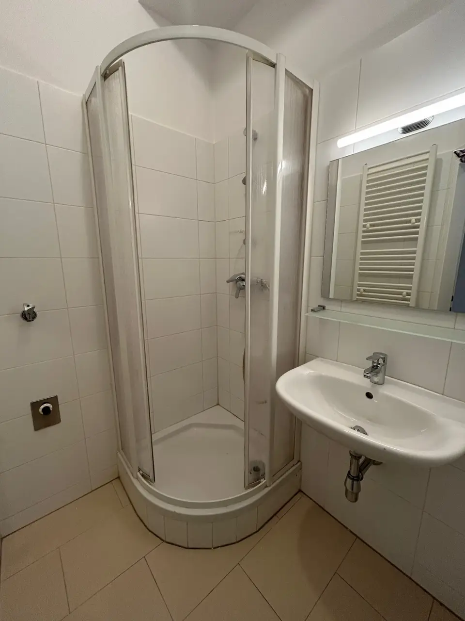 - Badezimmer mit Dusche und Waschmaschinenanschluss