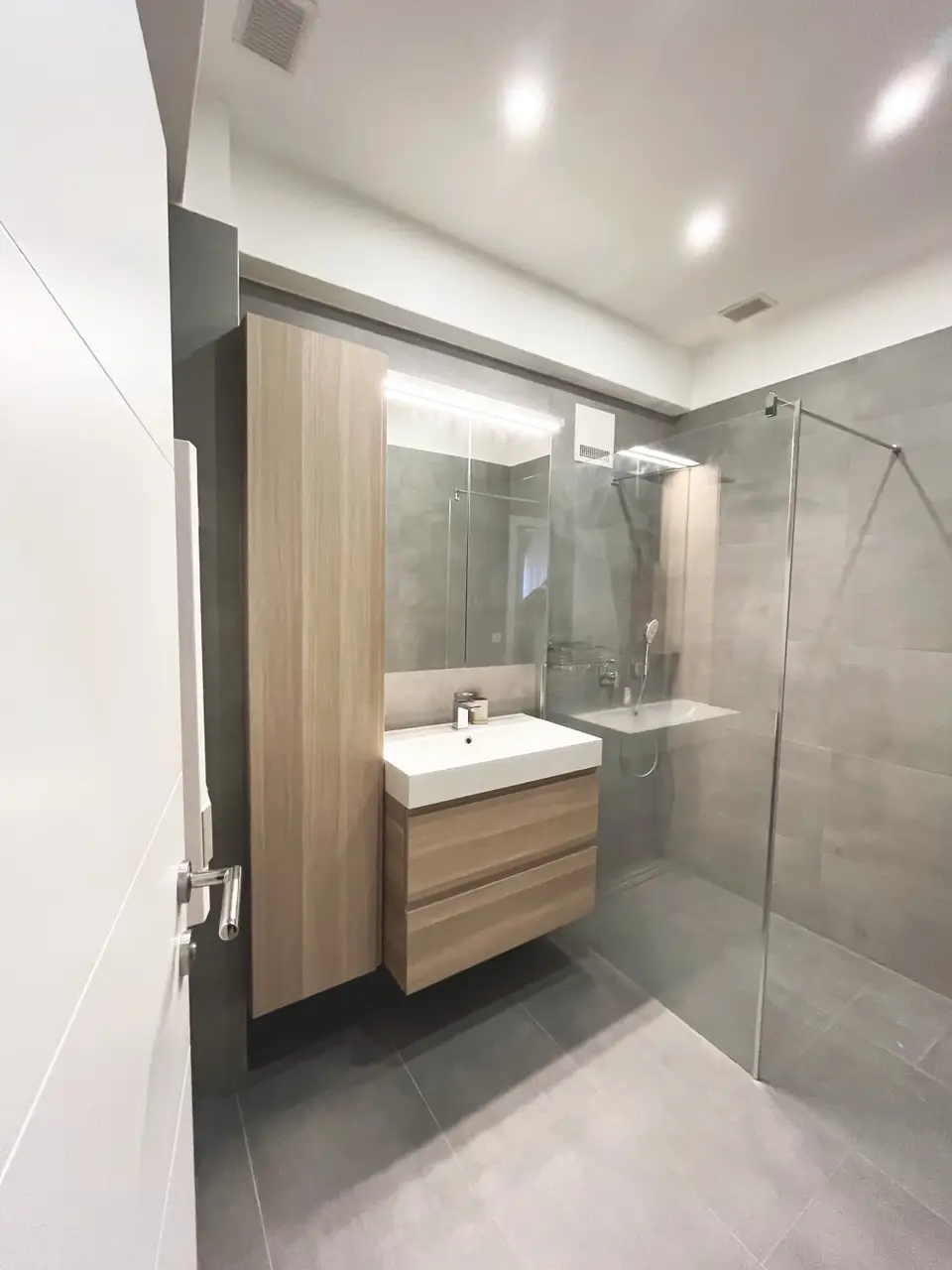 - Badezimmer mit Walk-in-Dusche und Waschmaschinenanschluss
