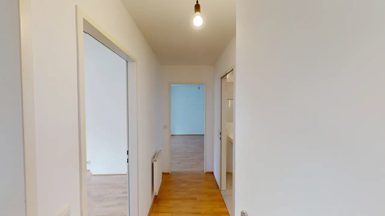 Die Wohnung mit ca. 75 m² Wohnfläche und ca. 7 m² Balkon befindet sich im 3. Obergeschoss (barrierefrei erreichbar) und umfasst einen Vorraum, eine Wohnküche, zwei Zimmer, einen Abstellraum, ein Badezimmer und eine separate Toilette.