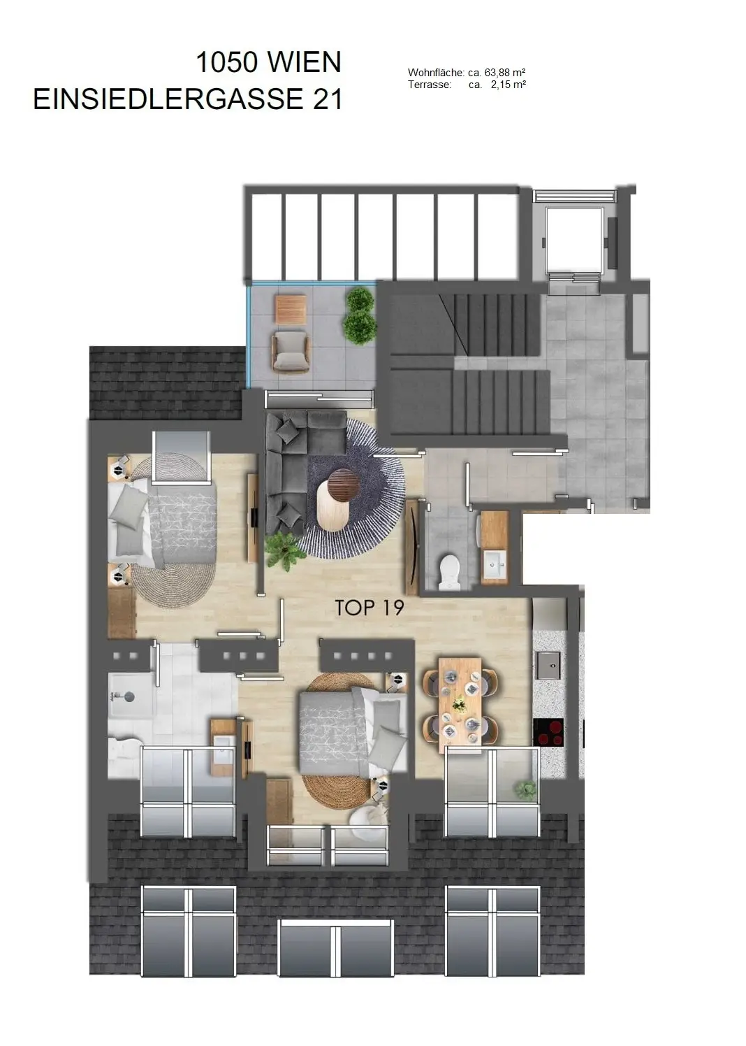 Die ca. 64 m² große Wohnung befindet sich im ausgebauten Dachgeschoss und überzeugt durch eine durchdachte Raumaufteilung. Sie bietet einen einladenden Vorraum, eine großzügige Wohnküche mit Zugang auf die Terrasse, zwei helle Zimmer sowie ein Badezimmer mit Toilette.