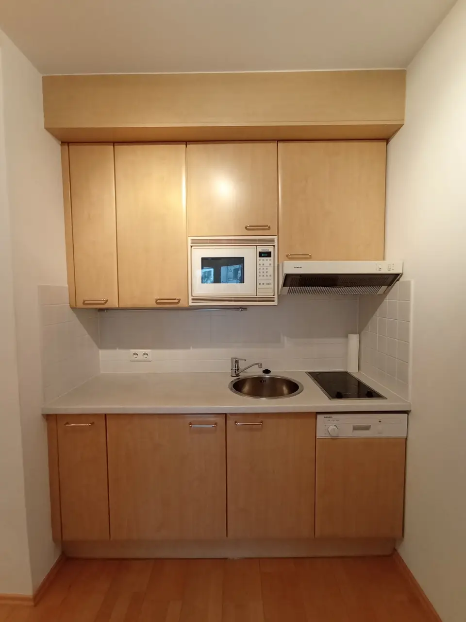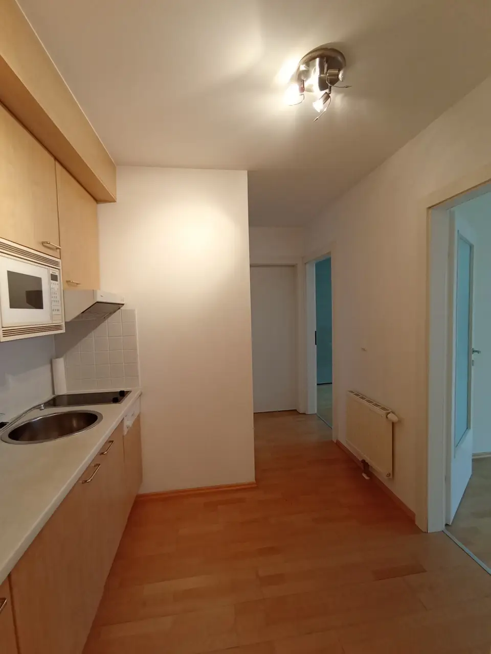 einen Vorraum mit offener Kochnische, einen Wohnraum mit Zugang auf den in den ruhigen Innenhof ausgerichteten Balkon, ein Schlafzimmer, ein Badezimmer und eine separate Toilette.