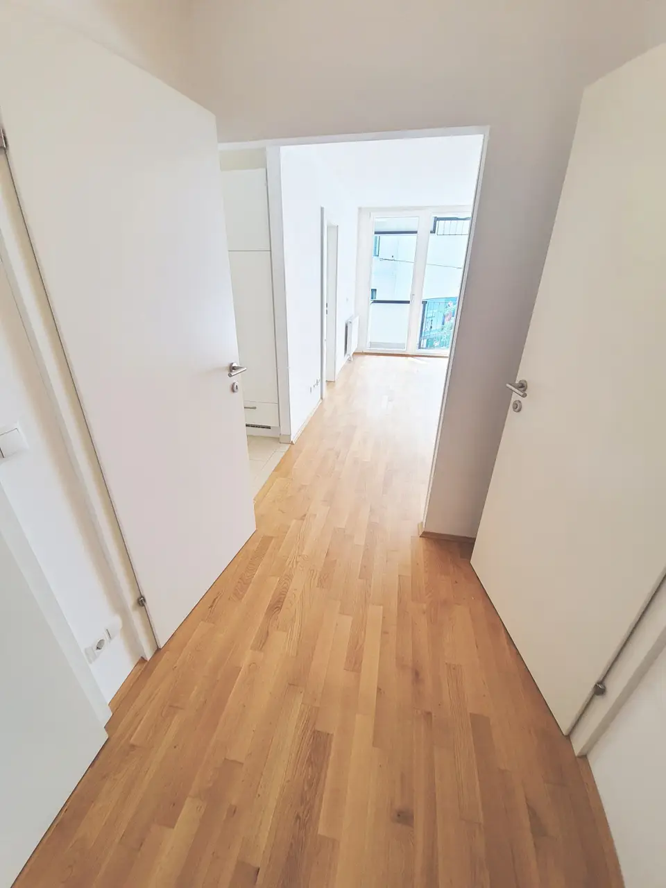 Die ca. 50 m² große Neubauwohnung befindet sich im 2. Obergeschoss und umfasst einen Vorraum, einen Wohnraum mit räumlich abgetrennter Kochnische, ein Schlafzimmer, einen Abstellraum, ein Badezimmer und eine separate Toilette.