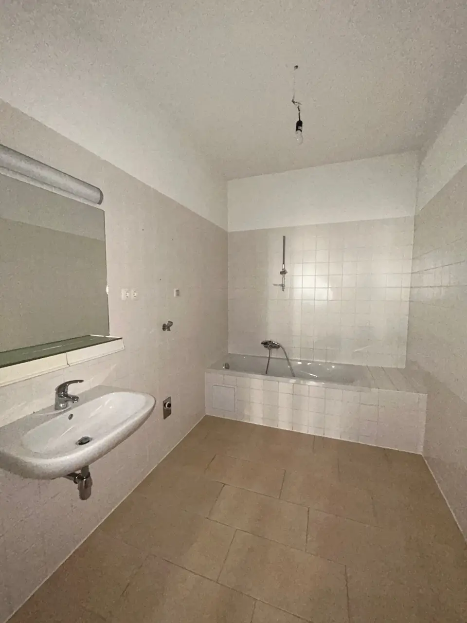 - Badezimmer mit Badewanne und Waschmaschinenanschluss