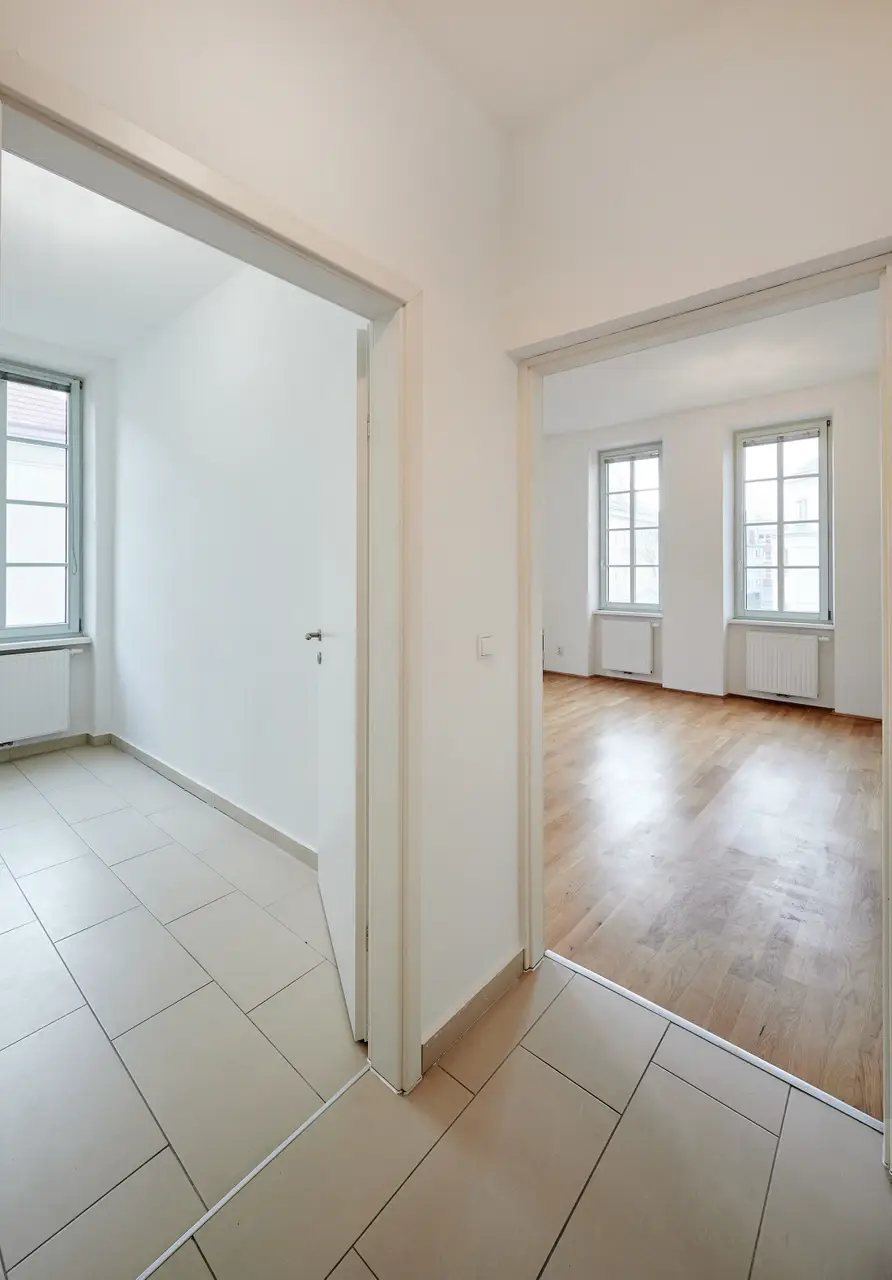 Die ca. 80 m² große 3-Zimmer-Wohnung (Vorraum, Küche, 2 Zimmer, 1 Kabinett, Bad und Toilette) befindet sich im 2. Obergeschoss eines gepflegten Gründerzeithauses, das 2006 saniert und ausgebaut wurde. Sie bietet – kurz-, mittel- und langfristig eine absolute Vorteilslage!