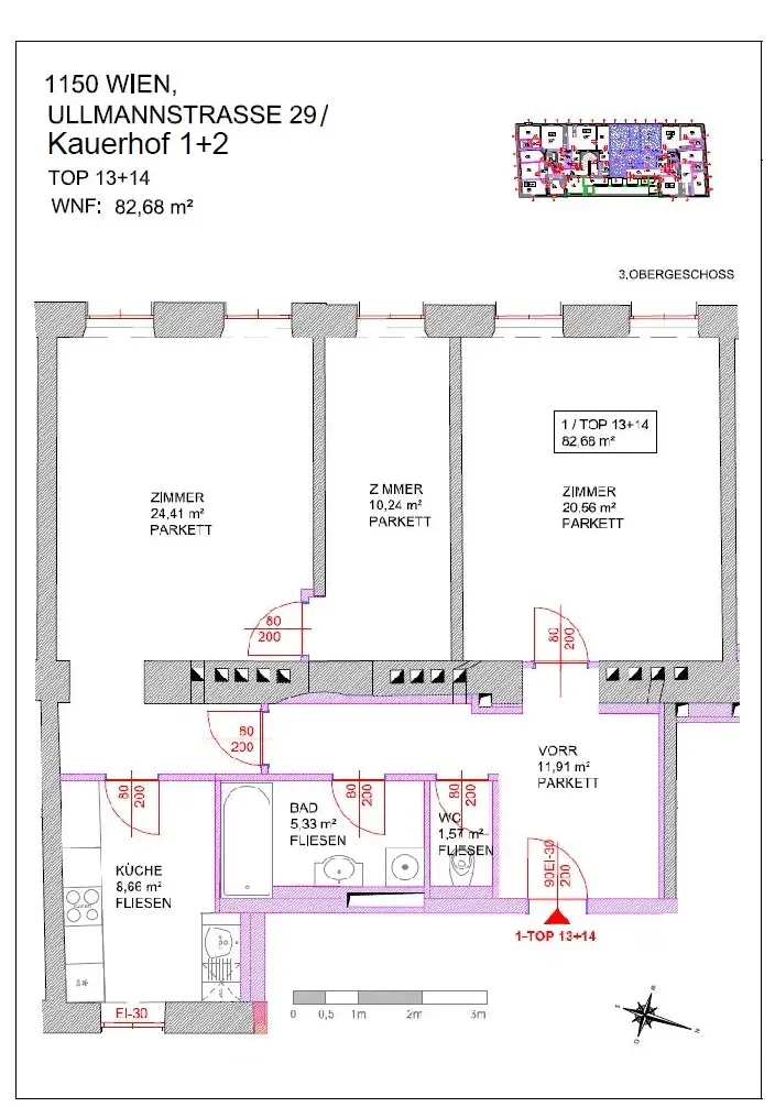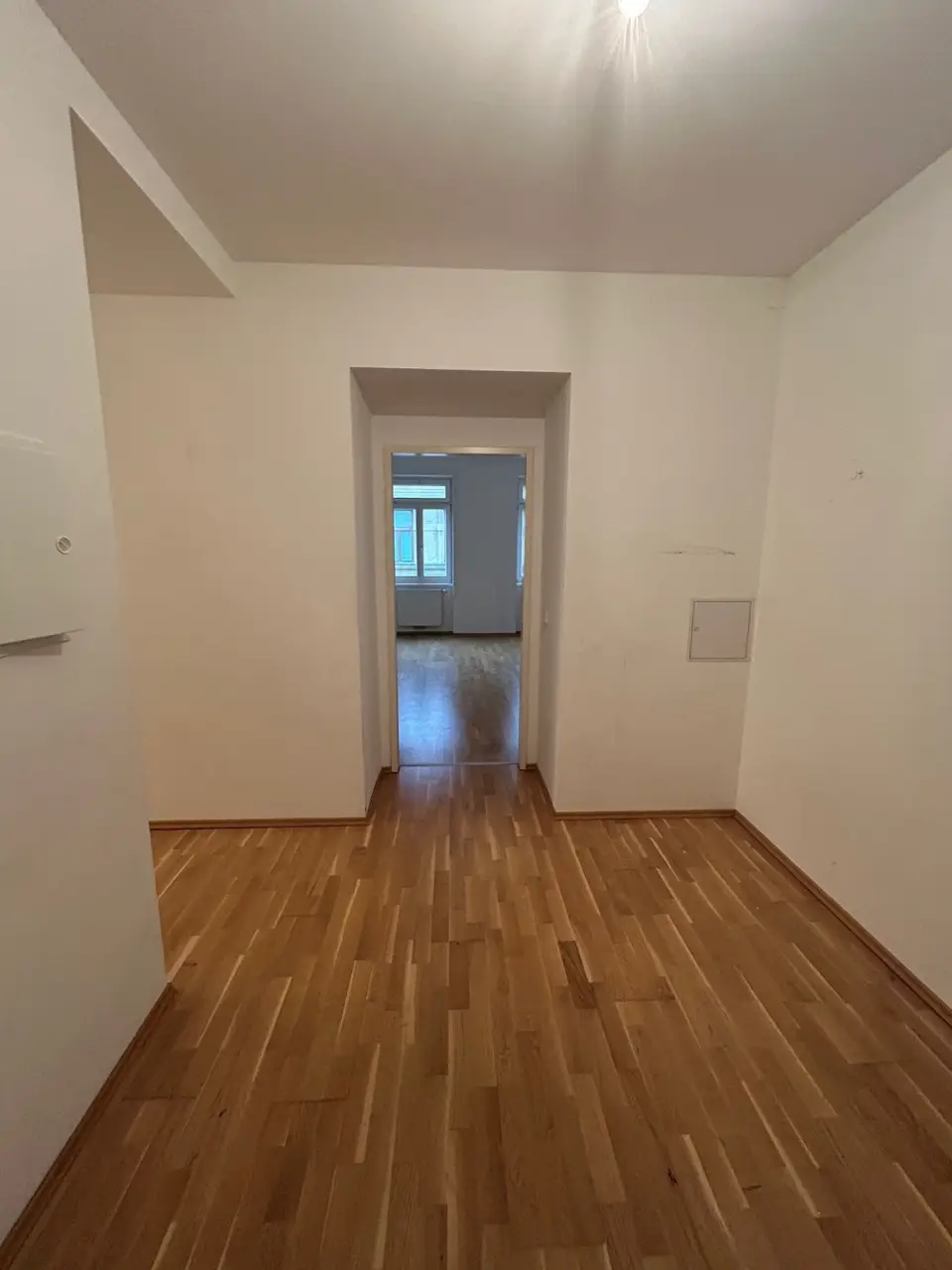 Die ca. 83 m² große Wohnung befindet sich im 3. Obergeschoss eines sanierten Altbauhauses und gliedert sich in einen Vorraum, einen Wohnraum, zwei Zimmer, ein Badezimmer und eine separate Toilette.