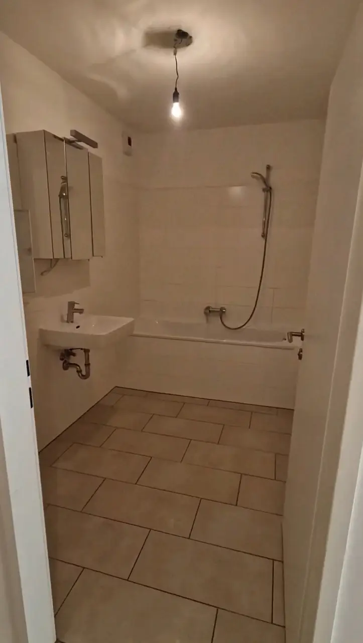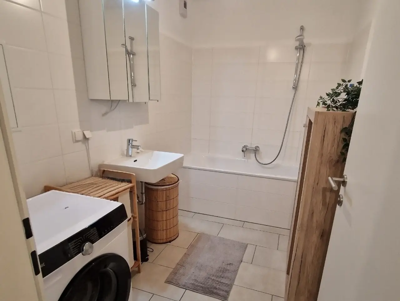 - Badezimmer mit Badewanne und Waschmaschinenanschluss