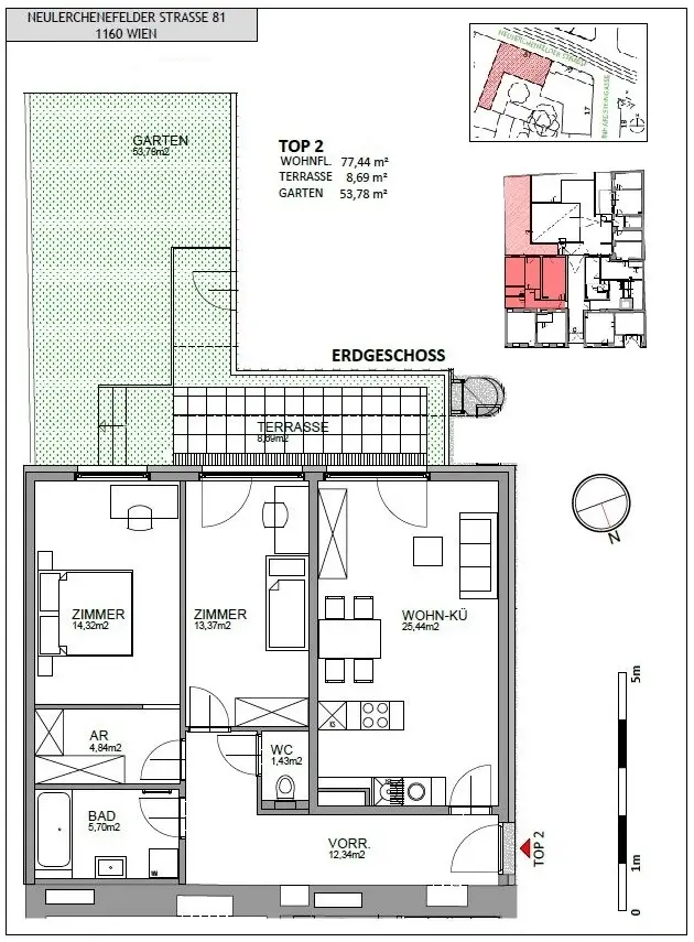 Die ca. 77,5 m² große Wohnung befindet sich im Erdgeschoss eines schönen, sanierten Gründerzeithauses (Neubau-Zubau) und gliedert sich in einen Vorraum, einen Abstellraum, einen Wohnraum mit Küchenzeile und Zugang zum Garten, zwei helle Zimmer - eines davon ebenfalls mit Zugang zum Garten, ein Badezimmer sowie eine separate Toilette.