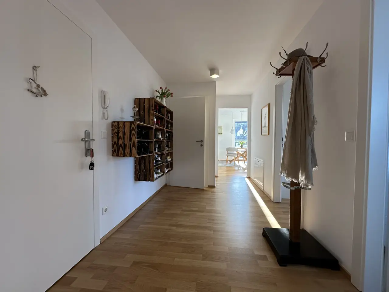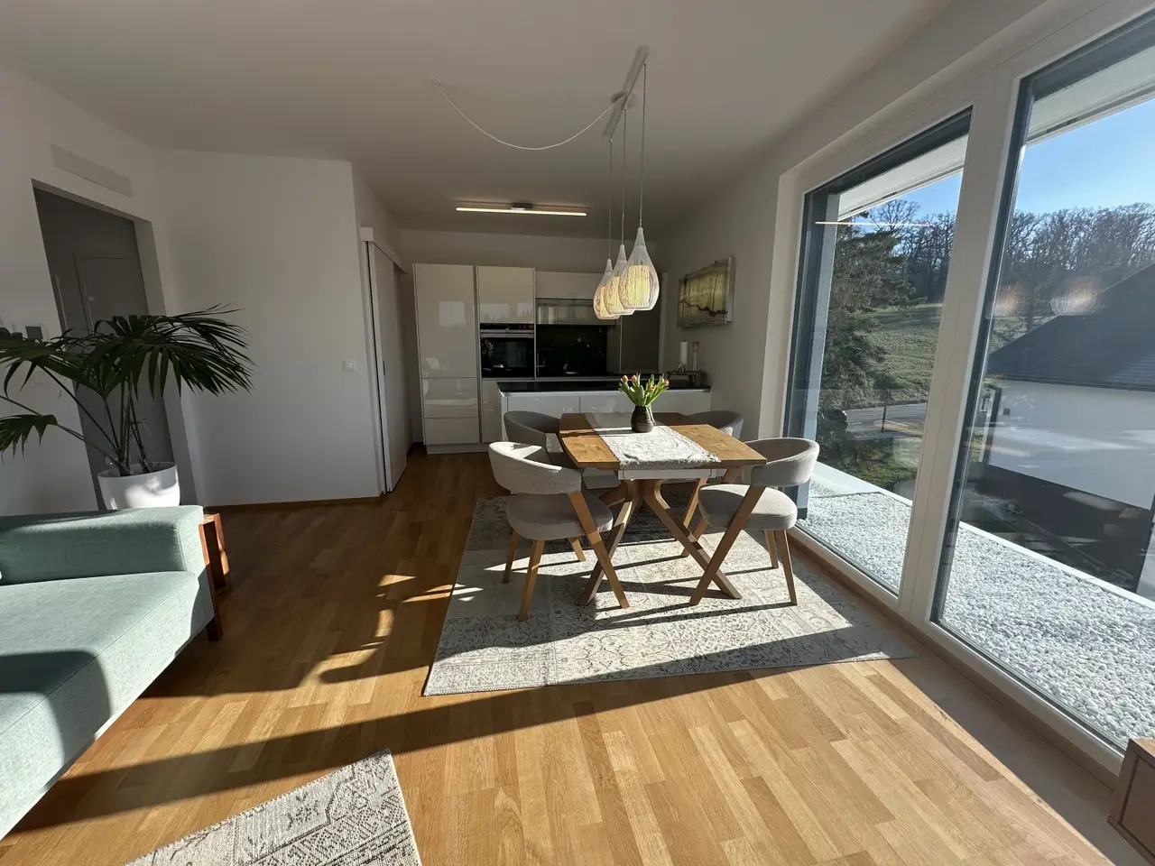 Die ca. 61,5 m² große Wohnung befindet sich im 2. Obergeschoss eines schönen Neubauhauses und gliedert sich in einen Vorraum, einen Abstellraum, eine Wohnküche mit Zugang zum Balkon, zwei helle Zimmer, ein Badezimmer sowie eine separate Toilette.